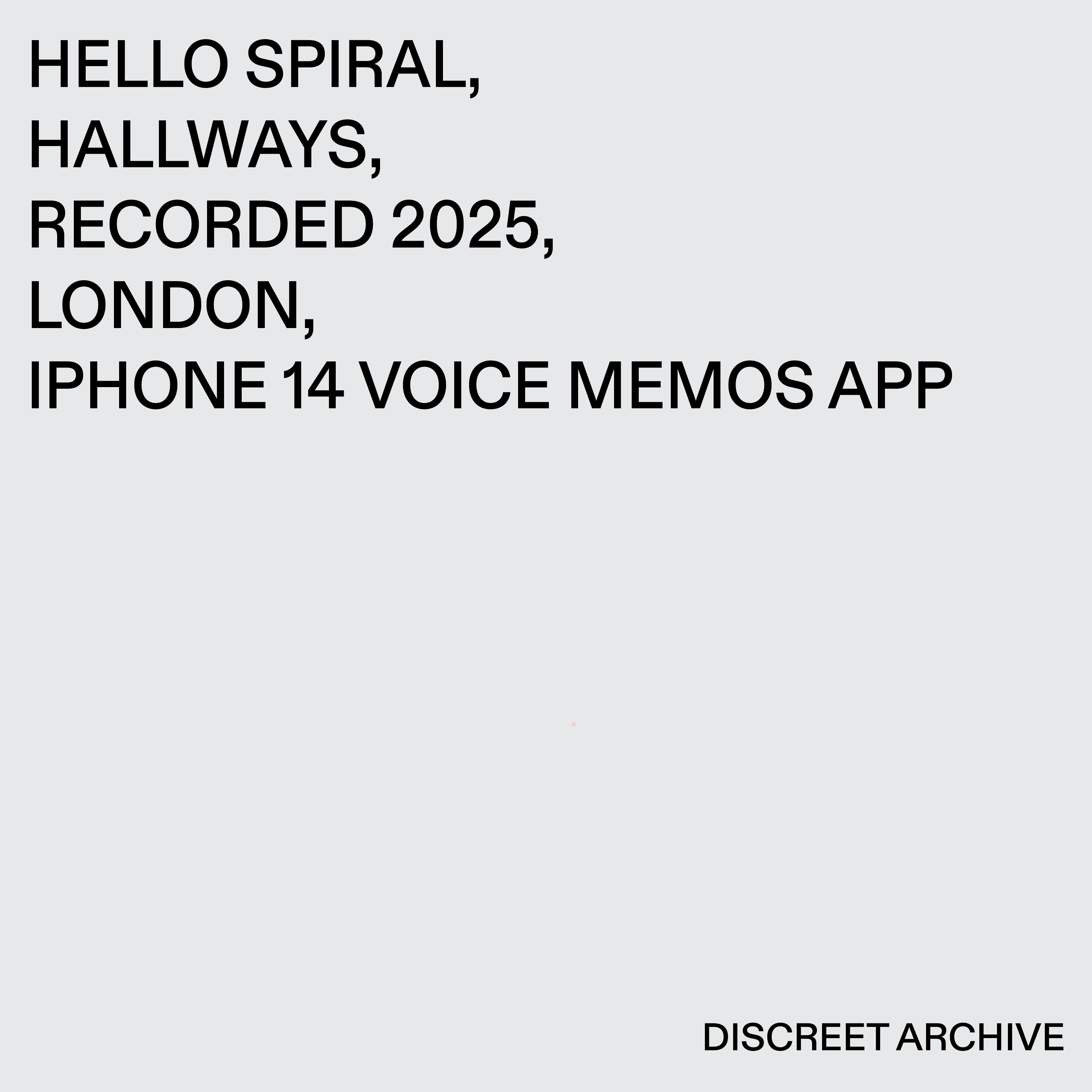 Hello Spiral returns to the same North London block, the same triangulated geometry of balconies and courtyard, but with a shift of orientation. His previous record looked outward from the eighth floor, these four new recordings move inside, into the building’s arteries. Joe explores the hallways of the complex where he has lived and listened for years, using the same tool as before, an iPhone and its voice memo app. The recordings were made in situ, each exactly eleven minutes, captured without ceremony.