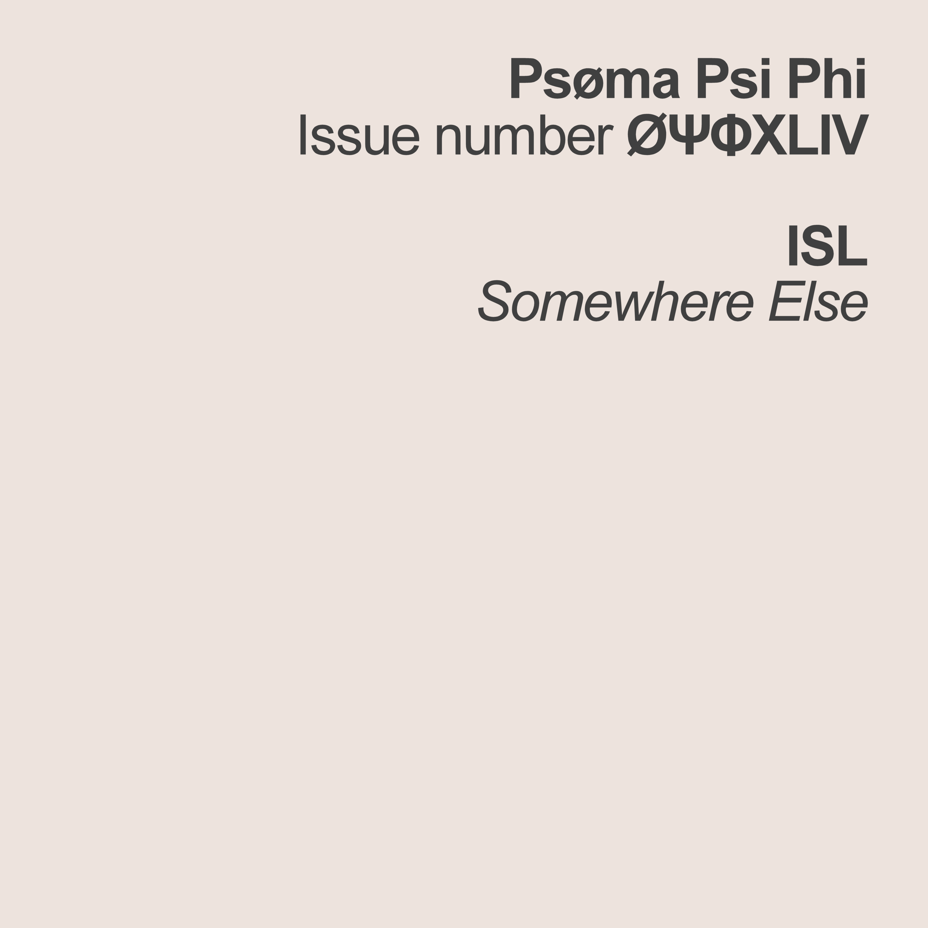 W/P by Jonathan Deasy and Brian Grainger. Recorded in stages between Winter 2021 and Winter 2023. Final mix by Jonathan Deasy. Design and text by ABM&D. Prose by Brian Grainger. This is Psoma Psi Phi number ØΨΦXLIV