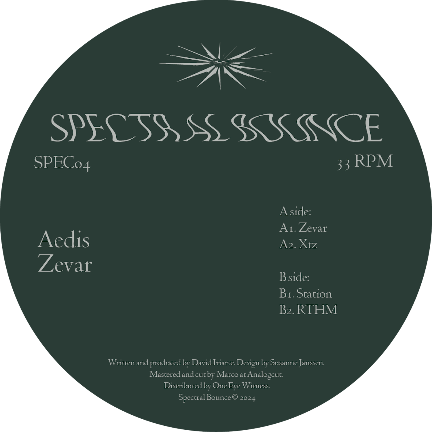 Spectral Bounce proudly presents Zevar, the debut release by Aedis. An alias of David Iriarte, this new undertaking sees the Amsterdam-based artist plumbing the depths & tunnelling further into a sound that has surely been in the works for some time. One half of Iro Aka, Iriarte is no stranger to the exploration of ambiance & rhythmic play: the duo released a trilogy of records on John Talabot’s label Hivern Discs between 2020 & 2023.