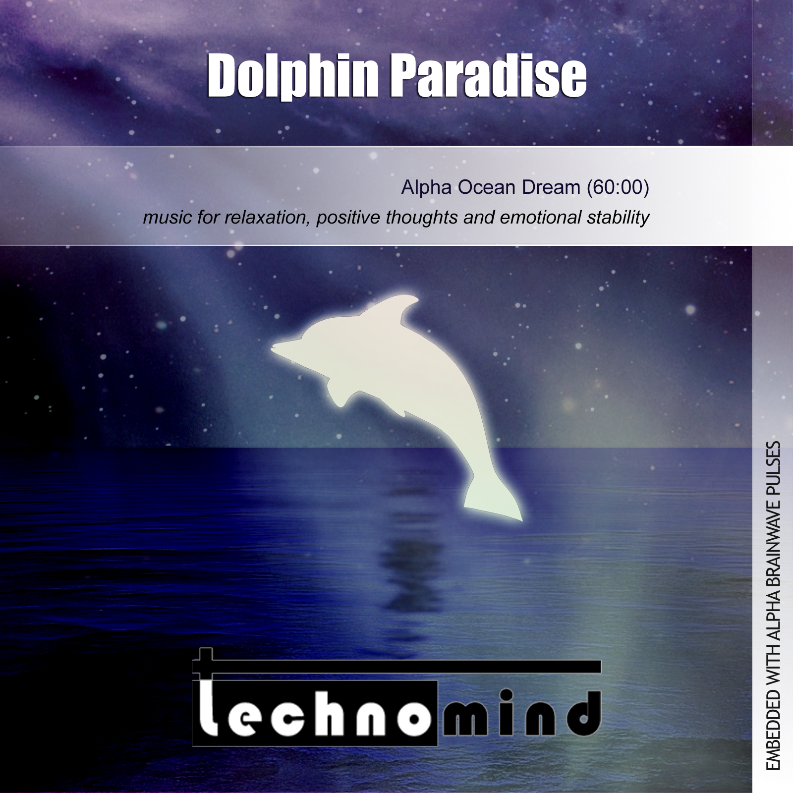 The Dolphin Paradise album is a 60 minute journey to the Dolphin's land. It has a soothing ambient music with several dolphin sounds and water sound effects. It was designed to help you achieve a state of relaxation and peace with Alpha brainwave pulses going from 10 Hz to 8.4 Hz.