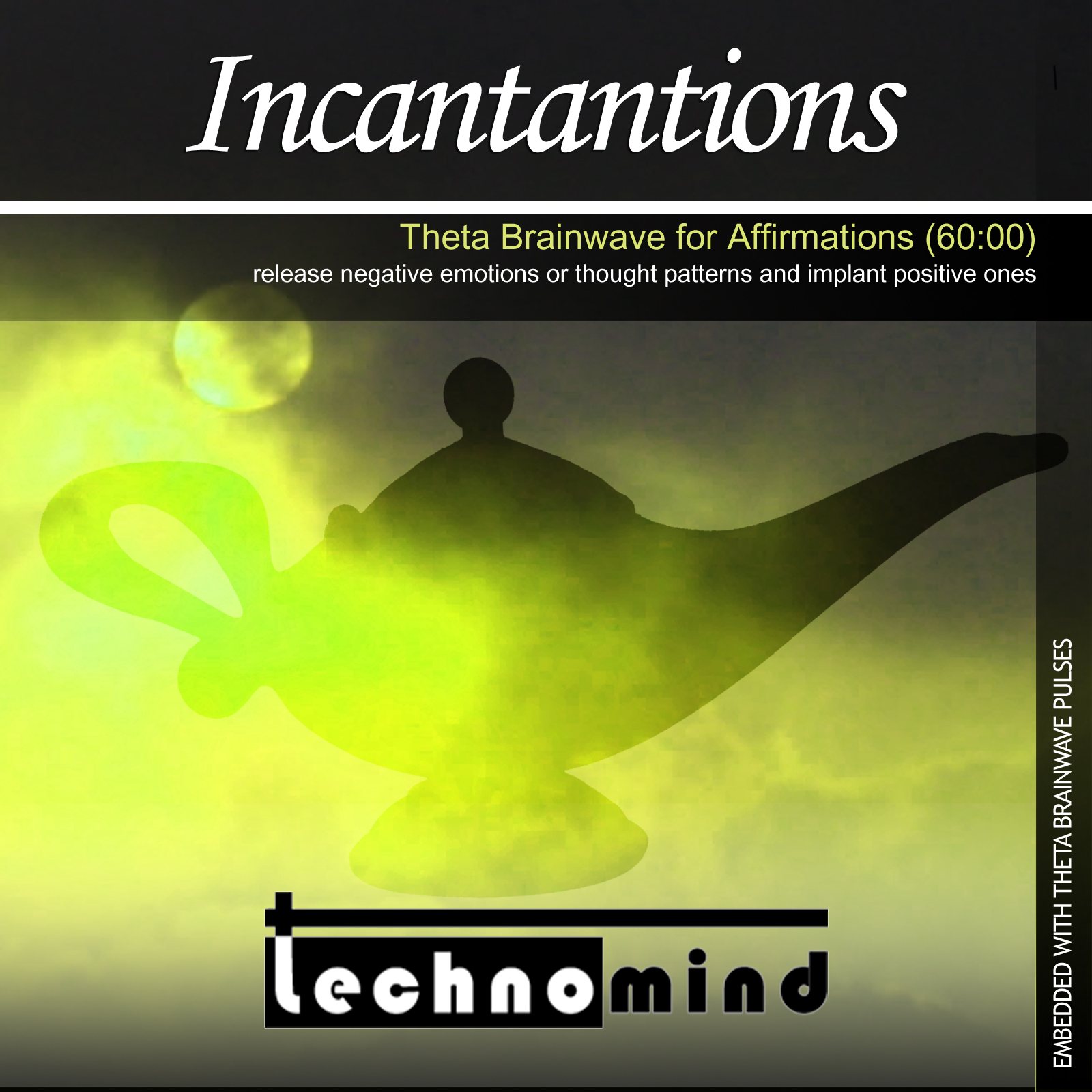 The Incantations album has 60 minutes of relaxing ambient music and was designed to help you reprogram your brain with incantations or affirmations. It is embedded with Theta brainwave pulses (8 Hz - 4 Hz). In the Theta brainwave range, the brain is extremely open to suggestion and new ideas.