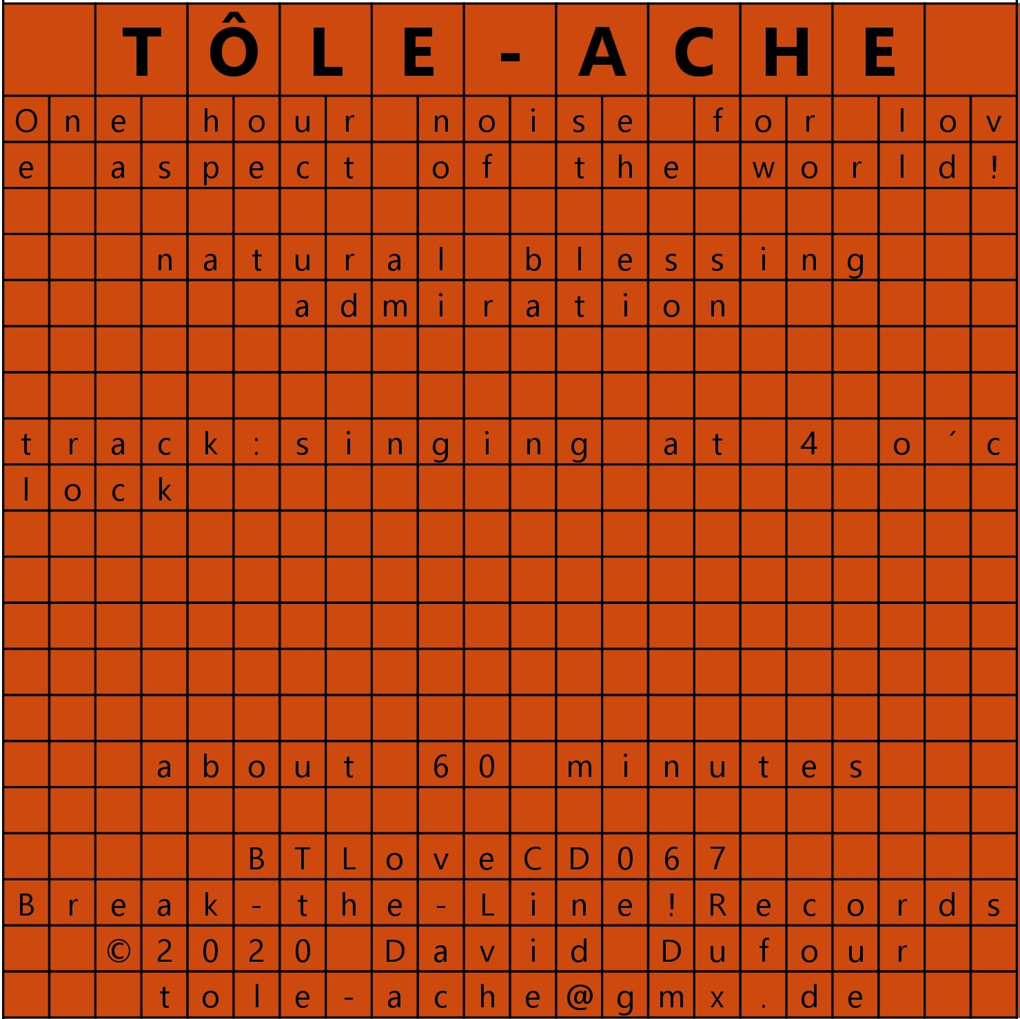 Tôle-Ache explores random sound effects and the psycho-acoustic impact of prolonged listening to sounds that either barely evolve or do not evolve at all.