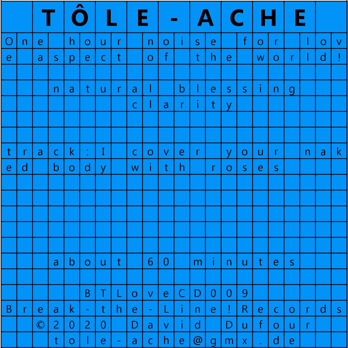 Tôle-Ache presents work on exasperation music, random sound effects and the psycho-acoustic effects during prolonged listening while the sounds do not evolve or evolve just a little.