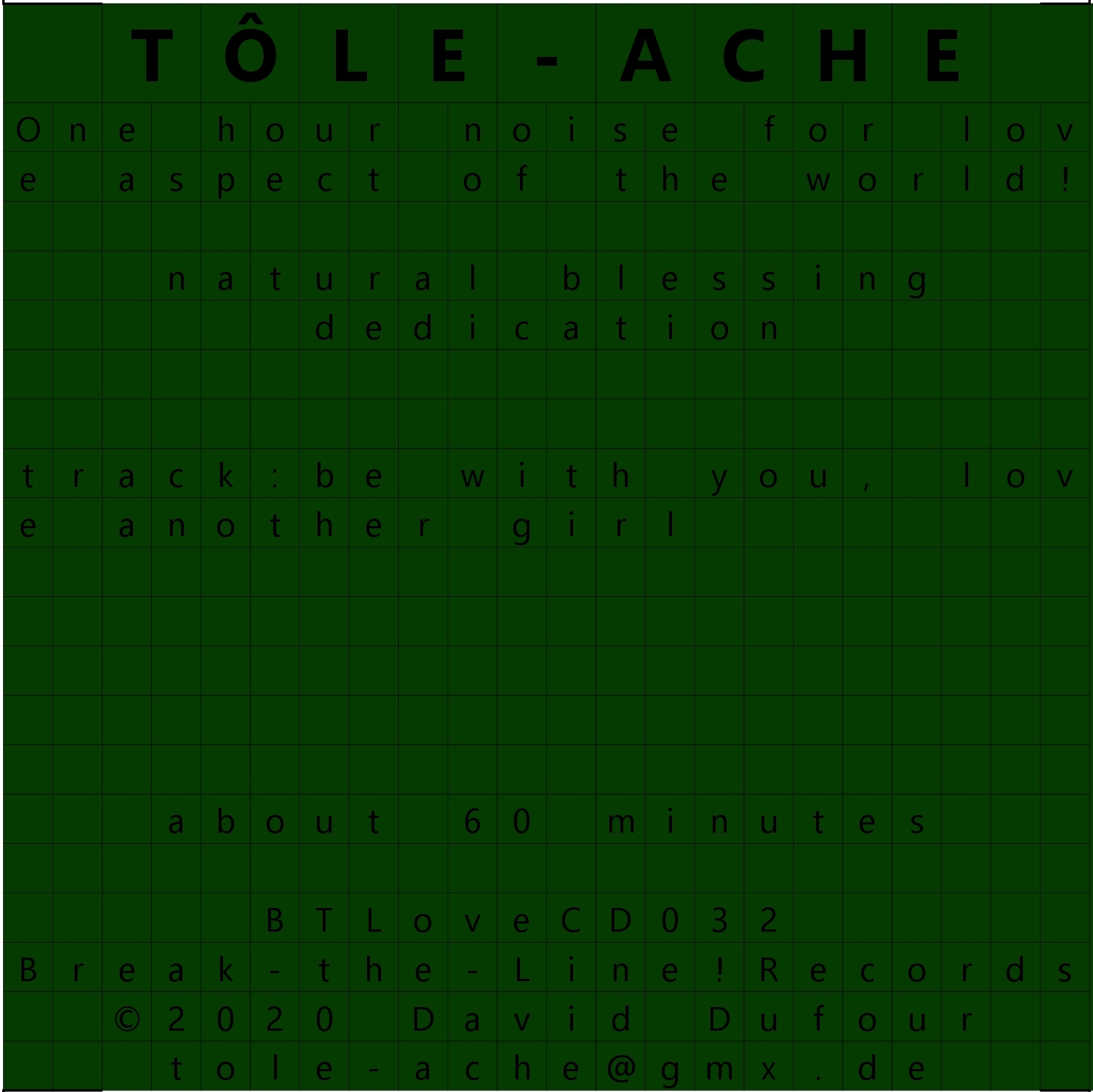 Tôle-Ache explores random sound effects and the psycho-acoustic impact of prolonged listening to sounds that either barely evolve or do not evolve at all.