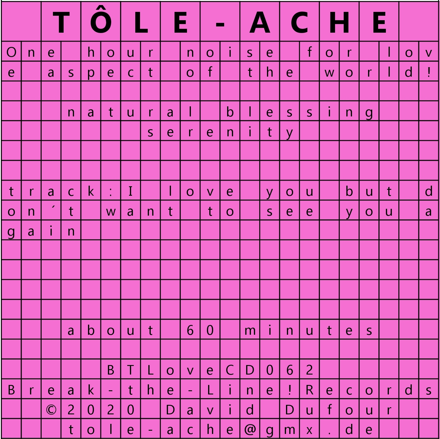 Tôle-Ache explores random sound effects and the psycho-acoustic impact of prolonged listening to sounds that either barely evolve or do not evolve at all.