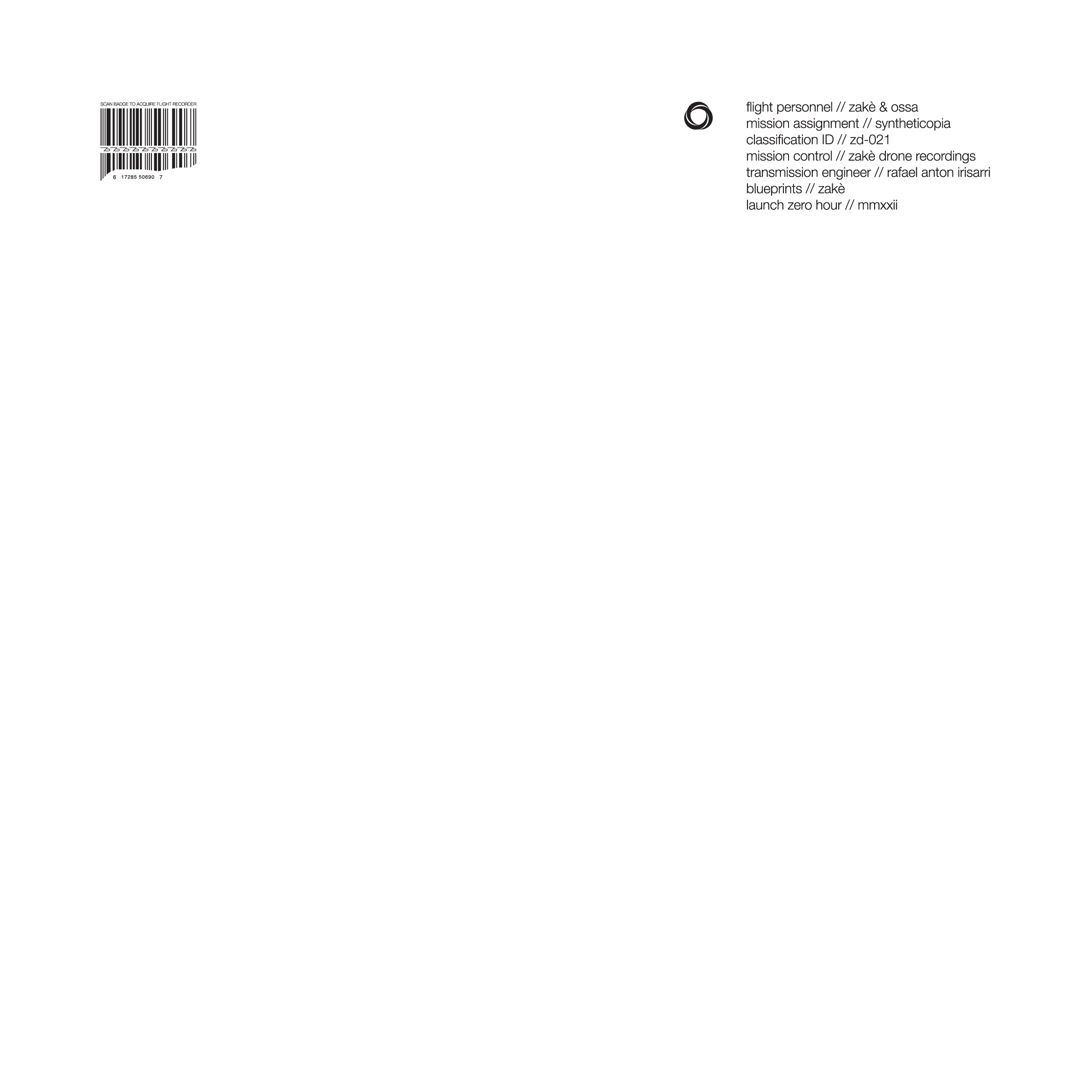 Written, recorded, and produced by zakè and Ossa. Celestial sound emissions by National Aeronautics and Space Administration. Mixed at Kaleidoscope Tone Studio (IN/US) by zakè. Mastered at Black Knoll (NY/US) by Rafael Anton Irisarri. Design and layout by zakè. ©℗ 2022 Zakè Drone Recordings.This is ZD-021. zakedrone.com. Instrumentation: Korg Minilogue XD Polyphonic Analog Synth. Moog DFAM Semi-Modular Eurorack Analog Synth. Moog Mother-32 Semi Modular Analog Synth. Poly D Polyphonic Analog Synth. DR-44WL Field Recorder. DR-40X Field Recorder.
